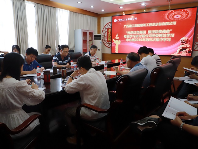 6月20日,广西建工集团建筑工程总承包有限公司党委理论学习中心组2019年第三次集中会议在公司三楼会议室召开,开展“传承红色基因,勇担职责使命”专题学习研讨,学习习近平总书记在“不忘初心、牢记使命”主题教育工作会议上的重要讲话精神、在纪念红军长征胜利80周年大会上的重要讲话精神以及今年5月视察江西的重要讲话精神。公司党委书记、董事长陈祖训主持会议并作主题发言,公司党委委员、领导班子成员参加并发言。