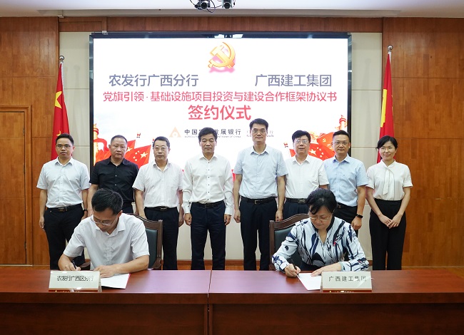 9月16日,广西建工集团有限责任公司与中国农业发展银行广西区分行在农发行广西区分行五楼一号会议室举行战略合作协议签约仪式。绿地大基建集团执行总裁、广西建工集团党委书记、董事长金宁运,集团公司党委副书记、总经理罗涛,农发行广西区分行党委书记、行长武建华,副行长蒋志强、朱晔出席并见证签约。集团公司副总经理李静丹与农发行广西区分行党委副书记、副行长胡天禄分别代表双方签署《党旗引领•基础设施项目投资与建设合作框架协议》。这是集团公司混改后与银行机构签订的第一个战略合作协议。