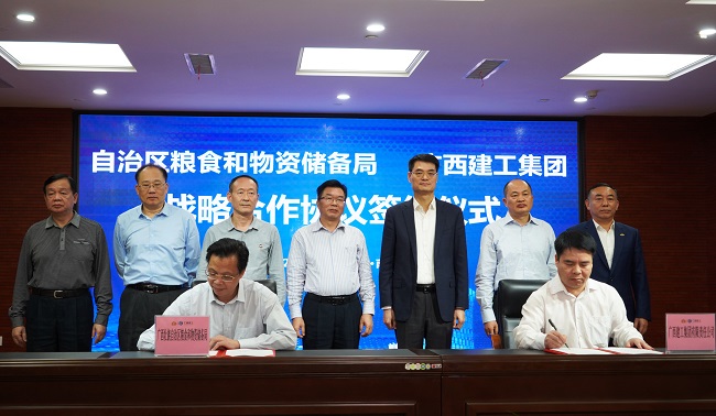 11月10日,广西建工集团有限责任公司与广西壮族自治区粮食和物资储备局战略合作协议签约仪式在建工大厦1号楼2301会议室举行。绿地大基建集团执行总裁、集团公司董事长、党委书记金宁运,自治区粮储局党组书记、局长吴宇雄分别致辞并见证签约。集团公司总经理、党委副书记、董事罗涛主持仪式。集团公司副总经理陈礼松、自治区粮食和物资储备局党组成员、副局长韦尚英分别代表双方签署战略合作协议。集团公司领导唐农生、汪启来,自治区粮食和物资储备局领导秦全贵、李国平、林愈溪、邱东参加。