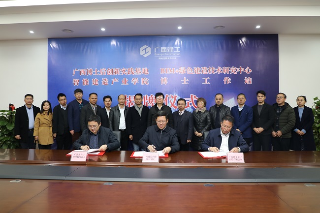 12月18日,广西建工集团有限责任公司在广西建工大厦2号楼二楼会议室举行“广西博士后创新实践基地”“BIM+绿色建造技术研究中心”“智能建造产业学院”“博士工作站”揭牌仪式及智能建造产业学院签约仪式。集团公司总经理、董事、党委副书记罗涛出席并致辞。广西建设职业技术学院院长吴昆,控股公司党委书记、总经理陆彪,广联达科技股份有限公司广联达工程教育副总经理谢军出席并签约。控股公司执行总经理刘永忠主持。
