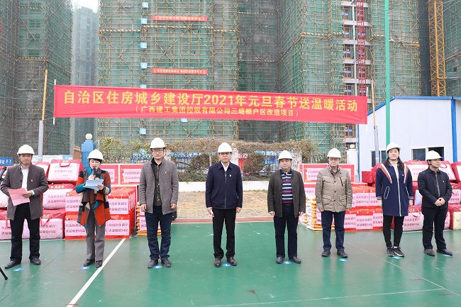 12月23日,自治区住房和城乡建设厅二级巡视员莫兰新率慰问组到一建公司轨道•壹号城项目、控股公司三塘棚户区改造项目开展2021年元旦春节送温暖活动。广西建工集团有限责任公司党委副书记陈家坚,党群工作部主任、党委统战部部长、工会副主席毛晓冬参加。