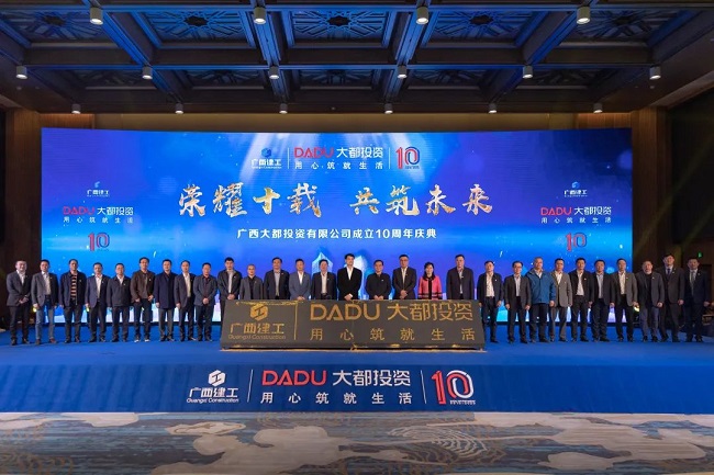 12月29日,广西大都投资有限公司成立十周年庆典在南宁市荔园维景国际大酒店荔景厅隆重举行,绿地大基建集团执行总裁、广西建工集团有限责任公司董事长、党委书记金宁运,集团公司总经理、党委副书记、董事罗涛出席并讲话。广西中汇投资有限公司董事长王学东,集团公司总经理助理、投资发展部总经理黄鸣,集团公司董事、总经理助理、资金管理中心总经理何一坚,大都投资公司领导班子成员邓少新、陈嶷、胡朝春、田思明参加。