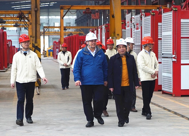 陈家坚深入生产车间、仓储区、办公区,详细了解武鸣基地生产经营及基础设施改造情况,认真听取施工升降机事业部及租赁分公司的工作情况汇报,对武鸣基地生产经营、基础设施改造建设等方面取得的成绩表示充分肯定。他指出,近年来,建机公司武鸣生产基地经过实施改造,基地面貌焕然一新,车间管理井井有条,已具有现代化企业形象。对基地未来发展,他提出四点要求。一要统一思想,尽快适应新机制。要尽快转变工作思路,认真贯彻落实集团公司混改后的各项工作要求,在思想上、行动上快速适应新形势、新要求,建立奖惩机制,推动绩效考核落实,实现能者上、庸者下。二要找好定位,精准发力。全面深化落实集团混改以及公司五年发展规划和三年行动计划的各项目标要求,在扩大产能的同时,切实抓好经营、生产、安全和质量等各项工作,持续推进降本增效,不断增强风险防范能力,实现稳健发展。三要加强沟通,信息共享。施工升降机事业部、租赁分公司要加强联动协作,多沟通、多交流,形成强大发展合力,通力合作满足客户需求,以生产推动销售,以高品质产品为市场开拓提供强力后盾。四要加强党建,引领发展。党建工作要与生产、经营深度融合,加强思想政治建设,提高政治站位,传承红色基因,充分发挥党支部的战斗堡垒作用和党员先锋模范作用。坚持“三会一课”制度,紧扣生产经营打造党建品牌,以党建引领高质量发展。
