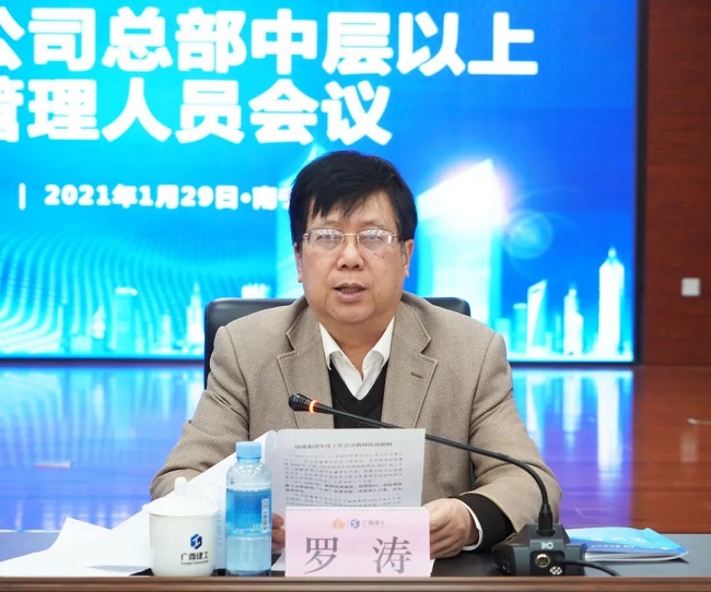 1月29日,广西建工集团有限责任公司中层以上管理人员会议在建工大厦1号楼2301会议室召开。会议传达学习绿地集团年度工作会议和绿地大基建集团年度工作会议精神,以十五字方针为指导,进一步解放思想,深化改革,转变机制,激发动力,团结带领集团上下为完成全年目标任务努力奋斗。绿地大基建集团执行总裁、集团公司董事长、党委书记金宁运出席并讲话。集团公司总经理、党委副书记、董事罗涛主持会议。领导班子成员陈家坚、余仲远、陈礼松、唐农生、侯立林、赖榆、李静丹、陆志斌、汪启来参加。