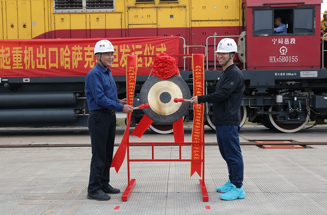 活动中,马义生和樊一江共同为此次货运鸣锣发车。随着金锣声响,载满塔机产品的专列启笛出发,预计三月中下旬到达哈萨克斯坦。