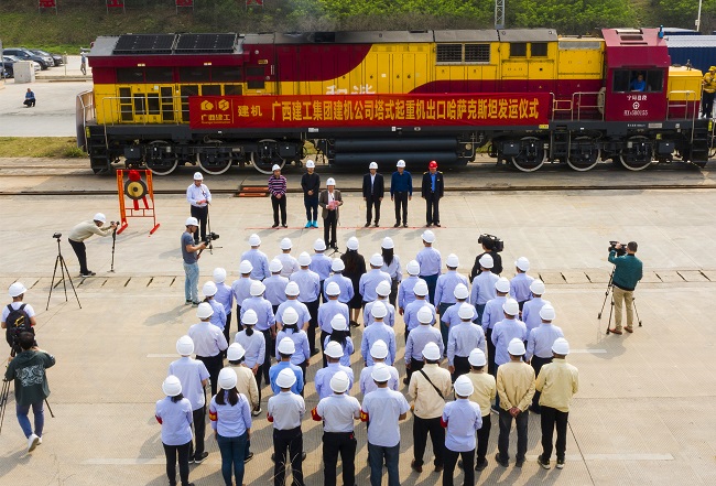 下午3时18分,价值近千万元的11台塔机装满49个车厢,组成中欧班列发往哈萨克斯坦努尔苏丹,成为广西发出的首趟重型机械中欧班列,为“一带一路”建设贡献“广西制造”、“广西建机”力量作出积极努力。