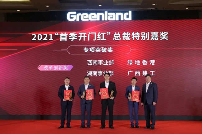 会议对荣获绿地集团2021年“首季开门红”总裁特别嘉奖的单位进行表彰,广西建工荣获季度最高奖——“业绩贡献奖”一等奖和季度“专项突破奖”——改革创新奖。张玉良为获奖单位颁奖,金宁运代表集团公司上台领奖。