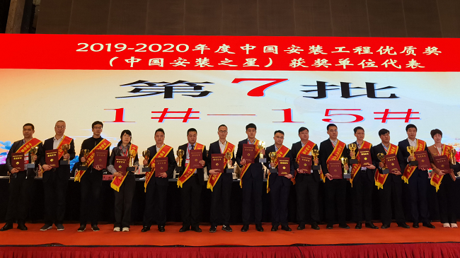 获得2019-2020年度第二批中国安装工程优质奖(中国安装之星)7个项目分别为:一建集团承建的广西建工大厦1#楼、2#楼工程(2#楼、地下室)(安装工程);二建公司承建的隆安县人民医院门急诊医技综合楼(民用建筑安装工程);五建公司承建的南宁浮法玻璃生产线整体搬迁升级改造项目浮法联合车间成品工段-钢结构安装工程;一安公司承建的韶能集团新丰生物质发电扩建工程2×30MW汽轮发电机组安装工程;二安公司承建的广西永盛石油化工有限公司石化仓储项目;总承包公司承建的北海市北郊水厂水质提标工程设计-采购-施工(EPC)工程(安装工程);冶建公司承建的柳州卷烟分厂“双喜”卷烟品牌专用生产线技术改造项目制丝车间机电安装工程。
