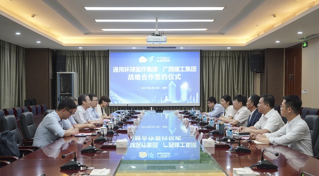 6月24日,广西建工集团有限责任公司与通用环球医疗集团有限公司战略合作协议签约仪式在建工大厦1号楼2302会议室举行。集团公司总经理、党委副书记、董事罗涛见证签约。集团公司财务总监汪启来和通用环球医疗集团副总经理牛少锋代表双方签署战略合作协议。