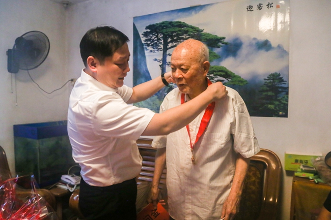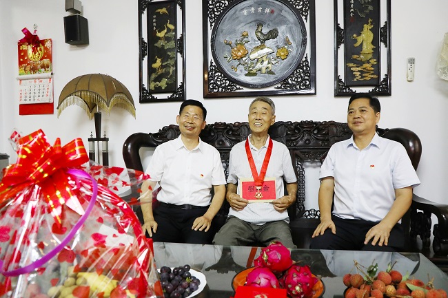 集团公司副总经理赖榆到一建集团公司慰问58年党龄的退休老党员李奋全,为他佩戴“光荣在党50年”纪念章,并送去党组织的关怀与祝福。