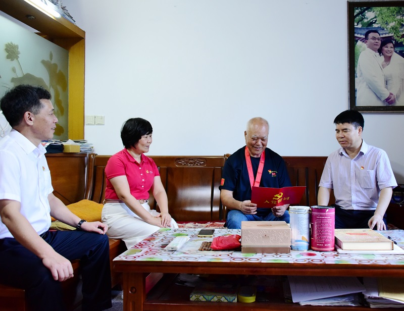陈礼松为黄镇京佩戴“光荣在党50年”纪念章,送上慰问金、《中国共产党简史》及入党誓词,与他共同重温入党誓词,并详细询问他的身体状况和家庭、生活情况。陈礼松对黄镇京说,作为一名转业军人、老党员、老同志,你在部队和企业始终爱岗敬业,坚持发扬党员先锋模范带头作用,为党的事业和企业发展作出积极贡献,是广大党员干部的学习榜样,希望你多多保重身体,继续关心支持企业发展,继续为党的事业和企业发展贡献智慧和力量。