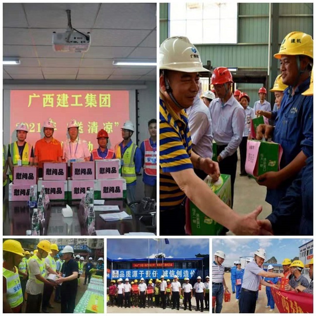 6月17日-7月9日,广西建工集团有限责任公司组织开展“送清凉”慰问活动。绿地大基建集团执行总裁、集团公司董事长、党委书记金宁运,总经理、党委副书记、董事罗涛,领导班子成员陈家坚、余仲远、陈礼松、唐农生、侯立林、赖榆、李静丹、陆志斌、汪启来分别率队到项目一线进行慰问,为一线职工和农民工送去清凉防暑物资,切实关爱生产一线人员的身心健康安全。