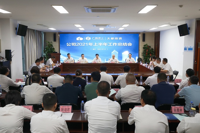 7月21日,广西大都投资有限公司在建工大厦1号楼6楼会议室召开2021年上半年工作总结会,传达学习集团公司上半年工作总结会精神,总结上半年工作情况,分析存在问题和不足,部署下半年重点工作。集团公司总经理、党委副书记、董事罗涛出席并讲话。大都投资公司董事长、党总支书记邓少新出席。执行总经理、党总支副书记陈嶷做公司上半年工作报告,副总经理、工会主席胡朝春主持,副总经理田思明参加。