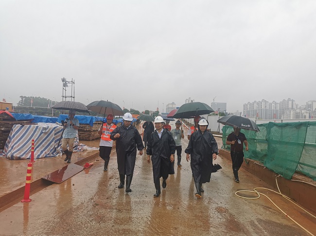 侯立林深入到项目现场,实地检查项目汛期安全防范准备工作。对当下汛期安全工作,他提出四点要求。一是要完善基坑边排水措施。项目部要及时完善基坑边截水沟等相关排水措施,确保基坑排水畅通。二是加强基坑内抽水工作。项目部要根据雨势及时增加抽水设备,确保基坑内水位在安全线以下。三是要做好基坑沉降观测工作。项目管理人员要每天实时观测沉降数据,特别是在汛期,要加大观测频率,确保基坑沉降数据稳定。四是要做好汛期防范工作。要高度重视做好台风、强降雨、洪水、雷暴雨等自然灾害的防范工作,做到早部署早安排,深入项目一线排查整改。