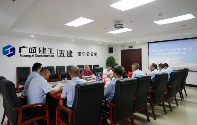 徐祥代表南宁分公司对集团公司领导的到来表示热烈的欢迎和衷心的感谢,对分公司1-7月份工作情况进行汇报,并表示,分公司将继续紧跟集团公司发展步伐,深入贯彻落实金宁运董事长在集团公司2021年上半年工作总结会上和陈家坚副书记在五建公司2021年上半年工作总结会上的讲话精神,抓好“八项重点工作”,做到“四个聚焦”,为推进集团公司改革发展取得新成绩砥砺奋进、再立新功。