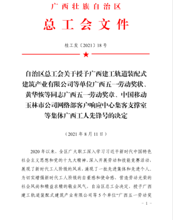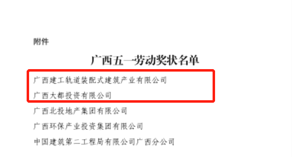 近日,自治区总工会公布了授予广西五一劳动奖状、广西五一劳动奖章、广西工人先锋号的决定,对展现新时代工人阶级风采的先进集体和先进个人进行表彰。广西建工轨道装配式建筑产业有限公司和广西大都投资有限公司荣获“广西五一劳动奖状”,集团金控公司董事长赵伯廷等四名同志荣获“广西五一劳动奖章”,集团二建公司广西电力职业技术学院新校区建设项目(一期)项目部蒋后生砌砖班组等5个集体荣获“广西工人先锋号”荣誉称号。