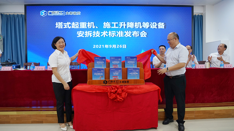 9月26日,广西建工大都租赁有限公司召开《塔式起重机安拆安全技术通用管理标准》等6部技术规程标准发布会。广西建工集团有限责任公司副总经理李静丹出席发布会,并与大都租赁公司董事长、党总支部书记黄安权共同为技术规程标准揭幕。