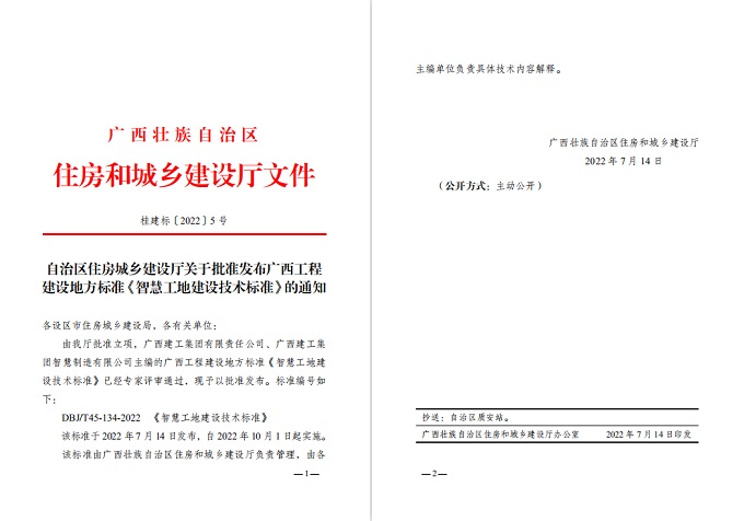 近日,广西建工集团有限责任公司和广西建工集团智慧制造有限公司共同主编的《智慧工地建设技术标准》由广西壮族自治区住建厅正式发布,并将于2022年10月1日开始实施。