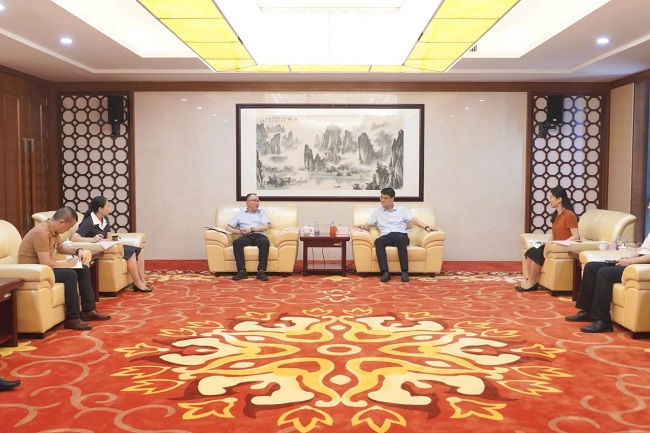 7月4日上午,绿地大基建集团执行总裁、广西建工集团有限责任公司董事长、党委书记金宁运在建工大厦会见广西国宏经济发展集团有限公司党委书记、董事长董家政,就加强合作进行深入交流。