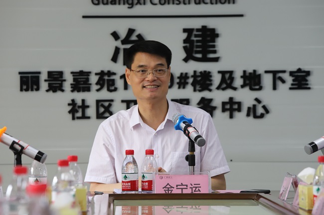 当天上午十点,金宁运到柳州后直奔项目现场,详细了解项目安全生产、材料采购、机械设备、临边防护等情况。在调研座谈会上,在听取公司汇报和有关分公司、项目部发言后,他对公司今年上半年实现“时间任务双过半”表示充分肯定,就做好下一步工作提出十点要求。一是抓好“不忘初心、牢记使命”主题教育。要提高政治站位,认真按照中央、自治区、集团公司党委的部署,按照“守初心、担使命,找差距、抓落实”的总要求,切实推动各项工作落到实处,确保取得实效。二是树立新发展理念。越是经营困难,越要坚持高质量,努力承接高质量项目,实施精细化管理,创造最佳效益,推动公司实现高质量发展。三是全力拓展经营工作。在目前市场经营压力较大的情况下,更要舞好经营“龙头”,立足广西市场、精耕柳州市场、扩大区外市场,亮出长处和优势,争取更大经营成效。四是全面强化管理。要重点加强分公司和项目部建设,分公司要做到“六强”,即经营要强、管理要强、队伍要强、能力要强、科技要强、党建要强。项目部要做到“六优”,即项目经理要优、承包模式要优、工程质量要优、安全生产要优、项目成本管理要优、项目支部建设要优。五是抓好应收账款工作。要积极推进应收账款工作,加快资金回笼。坚决实行项目“分账制”管理,加强资金管控,积极盘活停缓建项目。六是抓好人才和科技工作。要强化教育,增强人才队伍的事业心、责任感和敬业精神,提高专业能力,强化干事创业本领,做到能干事、会干事、干成事、不出事。重视科技工作,加大投入,多出工法、多发明专利,提高施工科技含量。七是深化体制改革。要按照集团公司股份制改革要求,全力配合和推进股改工作。各子公司也要进行股权改革,转换机制,充分调动发展内在动和。深化企业内部三项改革,加大薪酬制度改革力度。八是加强领导班子建设。领导班子要践行“担当为要,实干为本,发展为重,奋斗为荣”理念,担当实干,团结协作,推动发展。注重选拔敢担当、有业绩、廉洁自律的干部充实到各级领导班子中。九是抓好党建和党风廉政建设。要加强党建,深化“支部建在项目上•党旗飘在工地上”活动,促进生产经营。强化党风廉政建设和反腐败工作,树立斗争精神,敢于同损害公司利益的行为作斗争,决不允许发现问题推诿扯皮,做“甩手掌柜”,做老好人。十是关心关爱员工和农民工。要贯彻以人民为中心的发展思想,为员工办实事、解难事、做好事。关爱农民工,不拖欠农民工工资。做好防暑降温,优化施工环境,确保农民工身体健康。
