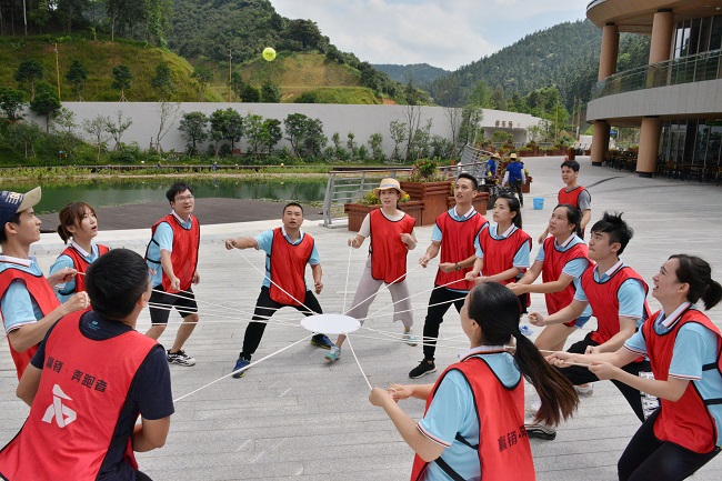 活动设置“鼓动人心”“一带一路”“万里长城”及合唱《我和我的祖国》等环节,培养团队精神,让参与者加深对“不忘初心、牢记使命”的感悟。在“一带一路”环节,体验者躺在8字型的绳索上,被队友高高抛起,自由落体时被队员齐心协力稳稳接住,考验彼此的信任;“鼓动人心”是队员一同拉紧圆板周围的绳子,让板处于水平状态,球在板上弹跳且不能落地,弹跳数量居多者获胜,目的是紧绷“思想”这跟弦,培养团队协作能力;“万里长城”环节,队员依次坐在后面队员的腿上,形成一个完整的圆,抵御来自长城内外的“攻击”,通过“砌长城、守长城、移动长城”体验团队精神与力量。