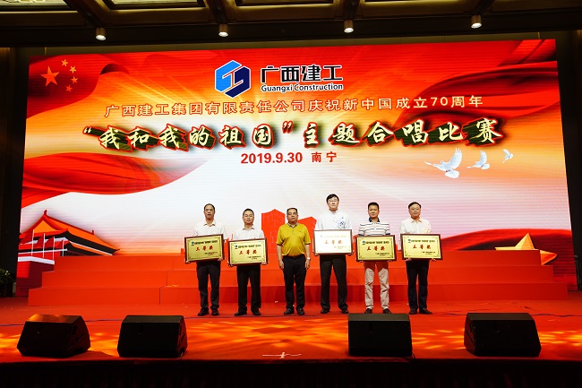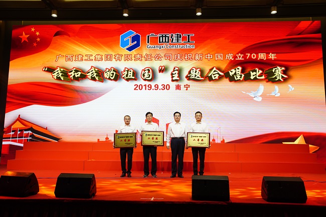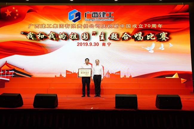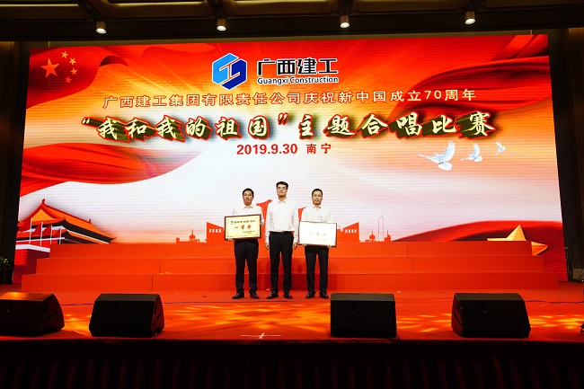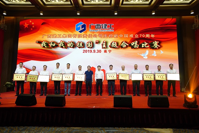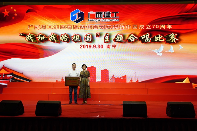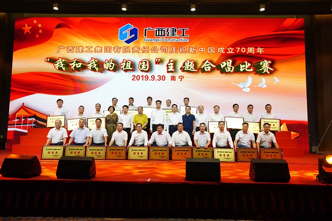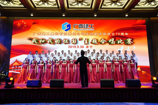9月30日,广西建工集团有限责任公司庆祝新中国成立70周年“我和我的祖国”主题合唱比赛在荔园饭店举行。集团公司党委书记、董事长金宁运,党委副书记、总经理、副董事长罗涛,副总经理陈礼松、总会计师李静丹和副总经理唐农生分别参加集团公司总部代表队和一安公司代表队登台演出并观看比赛和颁奖。集团公司党委副书记、工会主席陈家坚,纪委书记、自治区监委派驻集团公司监察专员余仲远观看演出并颁奖。