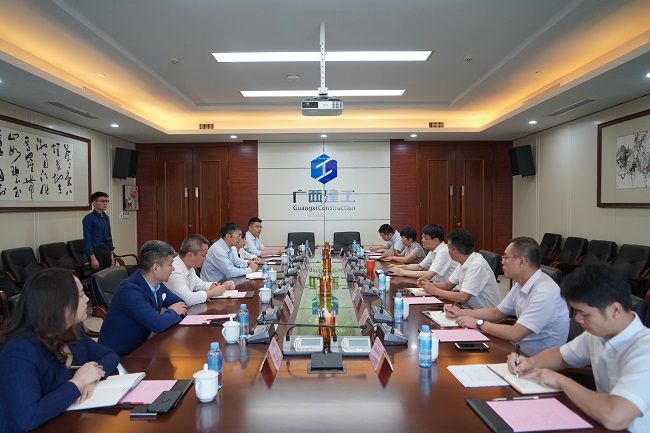 10月10日,广西建工集团有限责任公司党委书记、董事长金宁运,党委副书记、副董事长、总经理罗涛分别在建工大厦2213会议室会见广联达科技股份有限公司总裁袁正刚。