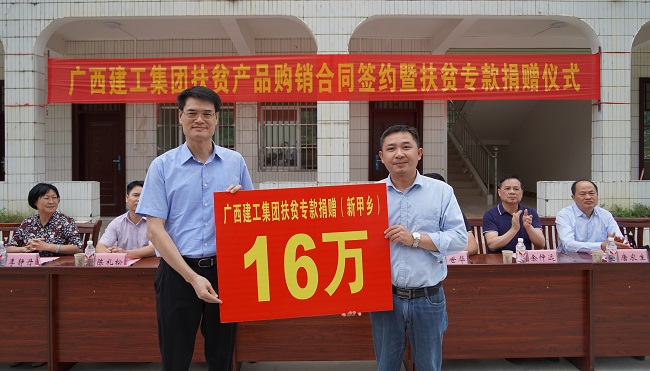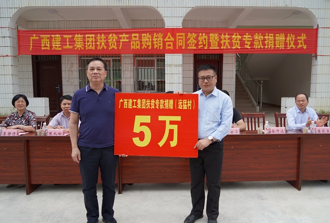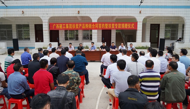 金宁运在广西建工集团扶贫产品购销合同签约暨扶贫专款捐赠仪式上讲话。他指出,集团公司始终带着信念扶贫,坚定打赢脱贫攻坚硬战的必胜信念,确保帮扶贫困村到2020年如期脱贫;始终带着责任扶贫,高度重视扶贫工作,积极履行帮扶责任,严格落实各项扶贫工作要求;始终带着感情扶贫,坚持以人民为中心的思想,用饱满的热情帮助贫困群众脱贫。对下一步工作,他要求,一是集团公司要继续按照既定扶贫工作方针,全力支持各项扶贫工作。二是各公司要继续关心和支持派驻工作队员的工作,让他们安心扎根扶贫一线。三是驻村工作队员要履行责任,密切和村“两委”班子配合,加强扶贫基础工作和村集体产业发展。