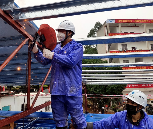 邕武医院扩建工程(临时负压病房)项目建设启动后,建机公司第一时间响应,1月29日即圆满完成该项目1500米围挡隔离、3套大门制作和安装任务。1月31日,公司又接到新任务,要完成414个厢房基座制作和安装(钢结构)、182个箱式板房改造和安装(包括卫生间、缓冲区、负压病房、医护区、病员活动区、医用传递窗等)、屋面结构制作和安装(1.4米净空屋面设备、隔热层)。这些工程量,按照正常施工需要一个月时间,而现在要求2月7日前要投入使用!
