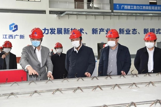 4月14日,江西省委书记刘奇到江西广新建筑产业有限公司新余装配式建筑产业基地项目调研复工复产情况。广西建工集团有限责任公司党委书记、董事长金宁运在现场介绍装配式建筑产业基地项目规划、生产线建设和产品情况。新余市委书记蒋斌、集团公司副总经理陈礼松陪同。