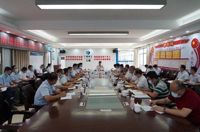 5月26日,广西建工集团有限责任公司建工城安置房项目抢工总结会在建工城项目7#地块三建公司项目部会议室召开,集团公司党委书记、董事长金宁运出席并讲话,集团公司副总经理侯立林总结项目抢工工作亮点和先进做法,分析存在不足,提出下一步工作措施。集团公司总经理助理、企业管理部部长刘新宁主持。