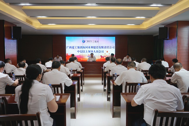 6月9日,广西建工集团海河水利建设有限责任公司在建工大厦2号楼1213会议室召开中层以上领导人员会议。集团公司副总经理、二建公司党委书记、董事长赖榆出席并讲话。二建公司副总经理,海河公司党委书记、董事长袁小军主持。