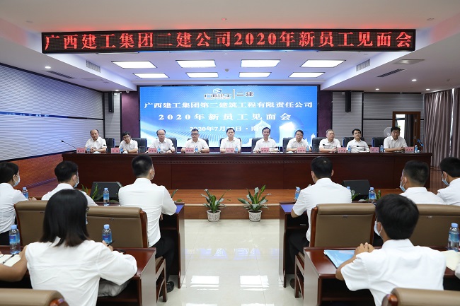 7月22日, 广西建工集团第二建筑工程有限责任公司召开2020年新员工见面会,会议设建工大厦2号楼912会议室主会场和1813会议室分会场。集团公司副总经理、二建公司党委书记、董事长赖榆出席并讲话。公司总经理邱国兴主持。领导班子成员黄志坚、苏维明、卢军宝、卫奕忠、叶彤、覃伟、黄元华、袁小军参加。