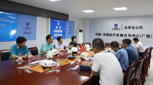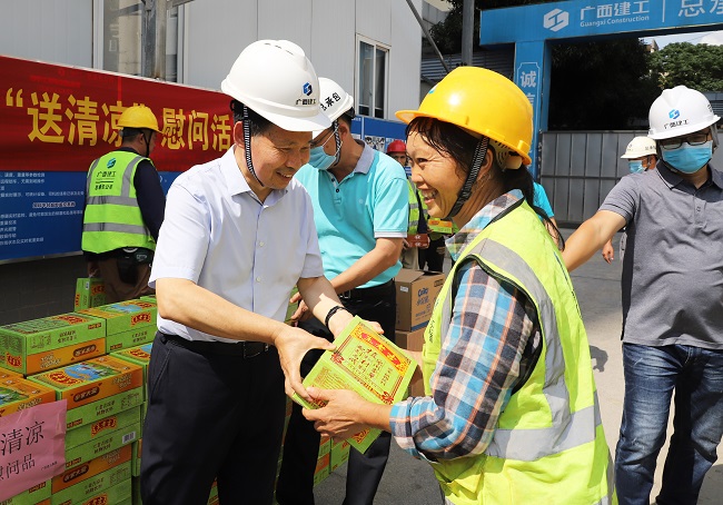 7月22日,广西建工集团有限责任公司副总经理侯立林到总承包公司直属分公司承建的中国—东盟医疗保健合作中心(广西)项目调研指导及开展“送清凉”慰问活动。集团公司市场经营部部长、工会女工委主任骆春燕,总承包公司党委书记、董事长陈祖训,党委副书记、纪委书记、工会主席岑廷义陪同。