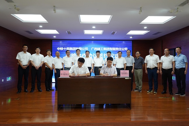 7月24日,广西建工集团有限责任公司与中铁十局集团有限公司战略合作协议签约仪式在建工大厦1号楼2306会议室举行。集团公司党委副书记、副董事长、总经理罗涛,中铁十局总经理李海峰出席并致辞。集团公司副总经理陈礼松、中铁十局党委副书记陈伟分别代表双方签署战略合作协议。集团公司总经理助理、企业管理部部长刘新宁主持。