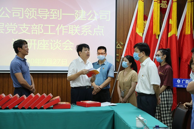 7月27日,广西建工集团有限责任公司党委副书记、副董事长、总经理罗涛到一建公司水电分公司党总支开展基层党支部工作联系点活动,了解联系点党建工作和分公司发展情况,指导基层党建工作,协调解决问题。一建公司党委书记、董事长蒙贵飞参加。