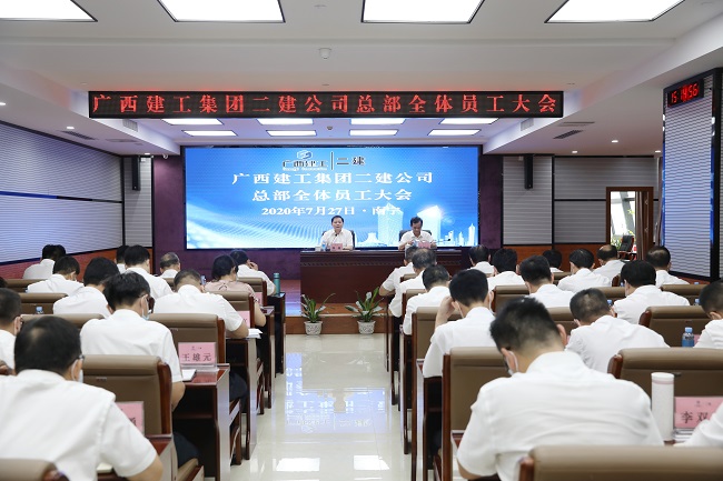 7月27日,广西建工集团第二建筑工程有限责任公司2020年总部全体员工大会在建工大厦2号楼912会议室召开。集团公司副总经理、二建公司党委书记、董事长赖榆出席并讲话,总经理邱国兴主持。公司领导班子黄志坚、苏维明、卢军宝、卫奕忠、叶彤、覃伟、黄元华、袁小军参加。