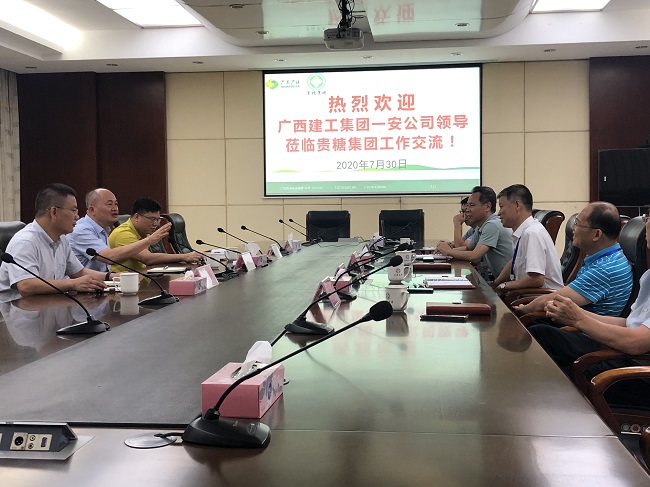 7月30日,广西建工集团有限责任公司副总经理、一安公司党委书记、董事长唐农生在广西贵糖(集团)股份有限公司总部会见贵糖集团董事长朱冰,双方就贵糖集团旗下糖厂技术改造升级和新建浆纸项目合作进行洽谈。