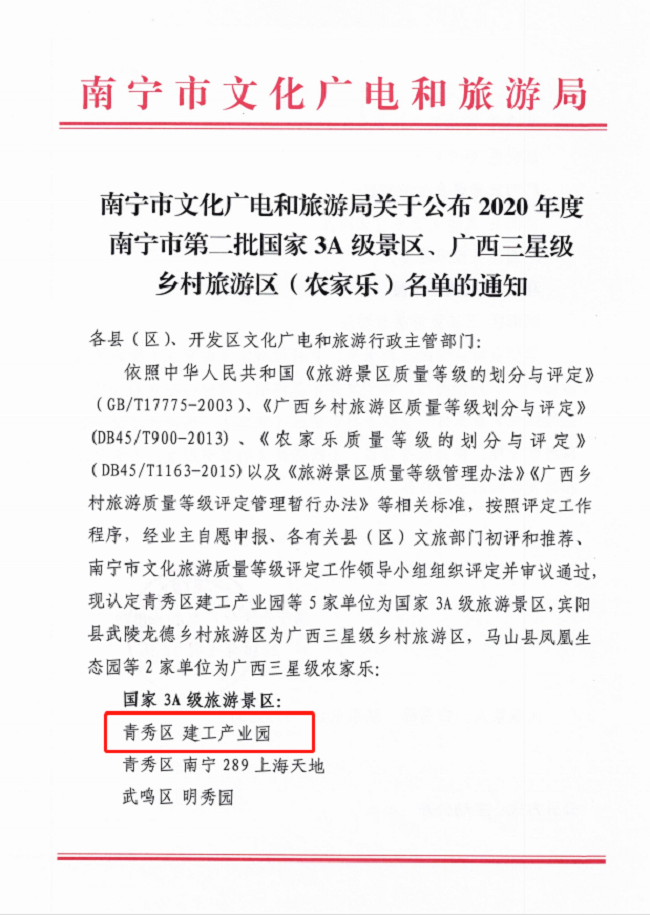 近日,经南宁市文化旅游质量等级评定工作领导小组组织评定并审议通过,建工产业园达到国家3A级旅游景区要求,正式批准为国家3A级景区。