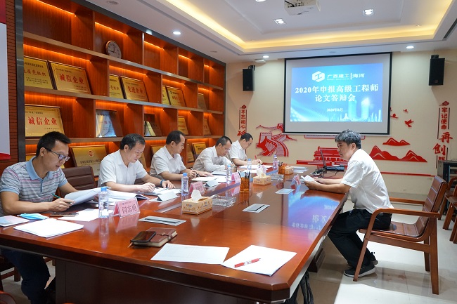 8月18日,广西建工集团海河水利建设有限责任公司在建工大厦2号楼1311会议室举办2020年高级工程师论文答辩会。公司副总经理陈万桥任答辩小组组长,总工程师莫开生等专家作为答辩小组成员,对申报高级工程师人员进行统一指导。