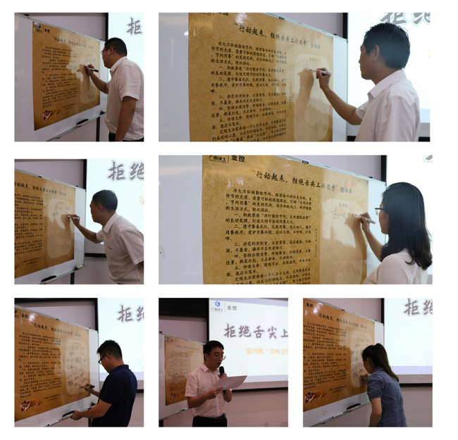 活动结束前,赵伯廷带领全体人员在“行动起来,拒绝舌尖上的浪费”倡议书上签字,倡议广大职工从我做起,从现在做起,用“小餐桌”带动“大文明”,努力做文明新风的宣传者、实践者和示范者,让厉行勤俭节约、反对铺张浪费在公司蔚然成风。