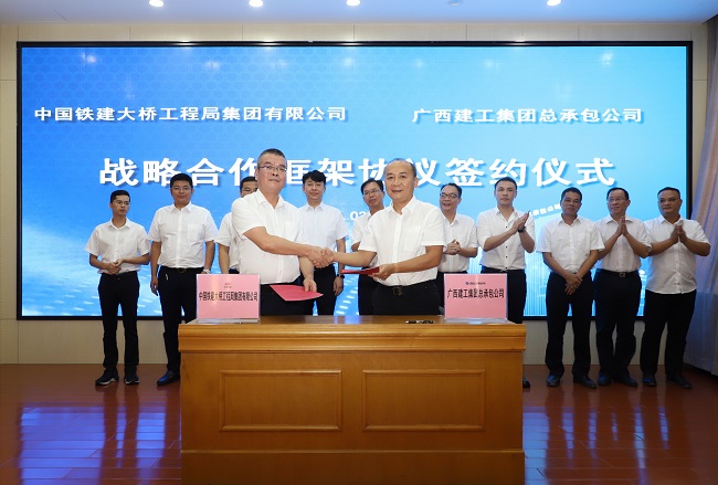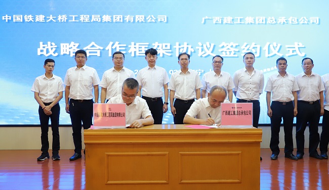 9月3日,广西建工集团建筑工程总承包有限公司与中国铁建大桥工程局集团有限公司战略合作框架协议签约仪式在公司13楼会议室举行。公司党委书记、董事长陈祖训,中国铁建大桥工程局集团华南区域指挥部总经理王长军出席并致辞。公司党委副书记、总经理陆烜与中国铁建大桥工程局集团华南区域指挥部副总经理兼广西指挥长韦龙分别代表双方签署战略合作框架协议。公司副总经理周兴耀主持。