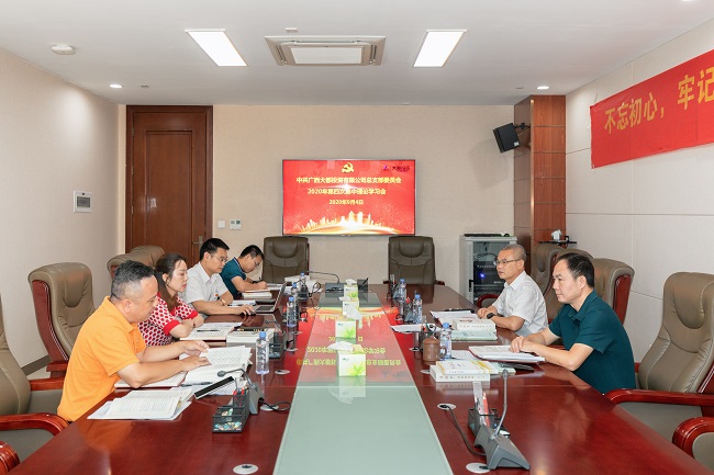 9月4日,广西大都投资有限公司党总支在会议室召开2020年第四次集中理论学习会。公司党总支书记、董事长邓少新主持并讲话,党总支副书记、副总经理、工会主席胡朝春参加。