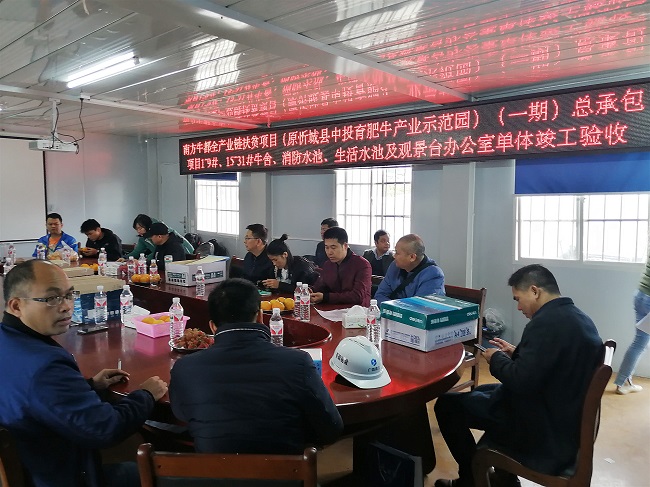 验收当天,由忻城县农业农村局(主管部门)、忻城县扶贫办、思练镇人民政府、建设单位、勘察单位、设计单位、监理单位、练江村委及村民代表等参建方组成的验收组,严格按验收标准,落实好疫情防控要求,到现场进行工程实体质量验收。在验收会议上,验收组认真听取各参建方对项目完成情况,查阅项目相关资料,随后到现场进行现场实测,最终验收组各单位一致同意南方牛都全产业链扶贫项目(原忻城县中投育肥牛产业示范园)(一期)总承包项目1~9#、15~31#牛舍、消防水池、生活水池及观景台办公室单体竣工验收顺利通过。
