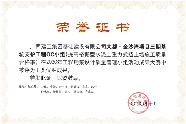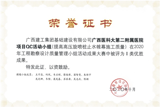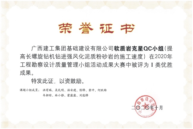 据悉,2020年基础公司共申报广西工程建设(勘察设计)质量管理小组成果12项,其中5项获评为自治区一等奖,并获广西勘察设计协会推荐至中国勘察设计协会参加2020年工程勘察设计质量管理小组活动成果大赛,最终公司质量管理小组活动优秀成果《提高高压旋喷桩止水帷幕施工质量》《提高长螺旋钻机钻进强风化泥质粉砂岩的施工速度》《提高格栅型水泥土重力式挡土墙施工质量合格率》3项内容获评为全国Ⅰ类成果,公司在该奖项上实现零的突破。