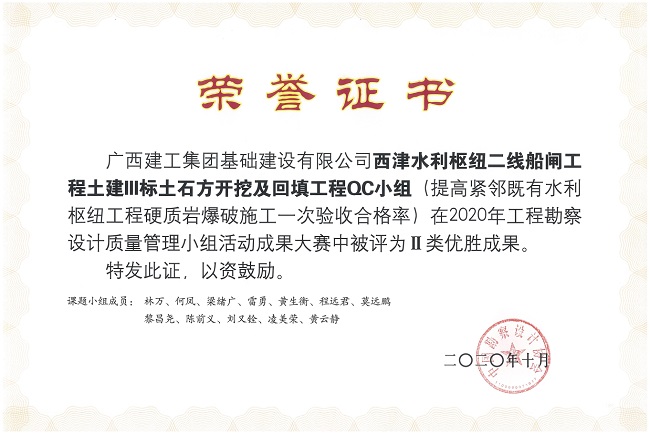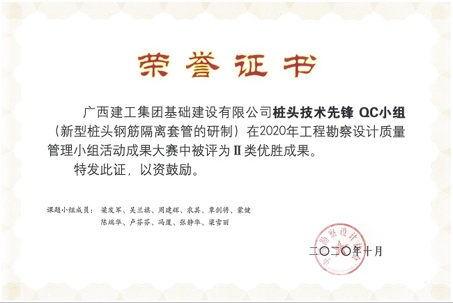 基础公司高度重视工程质量管控,鼓励项目人员开展QC活动提供工程施工质量。近年来,公司质量管理小组活动的开展逐渐规范化,并通过质量管理小组活动激发项目人员的创新性,解决项目施工遇到的问题。公司的质量管理小组活动在区内同行业中已达到领先水平,公司连续两年荣获“广西工程建设(勘察设计)QC小组活动优秀企业”。