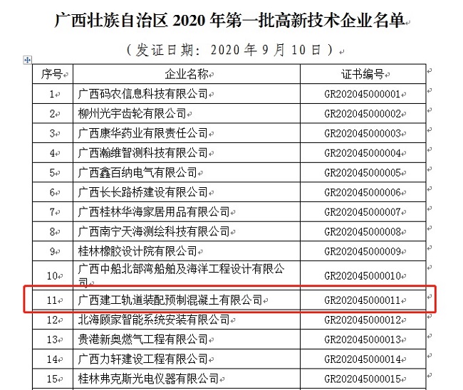 近日,全国高新技术企业认定管理工作领导小组办公室对《广西壮族自治区2020年第一批高新技术企业名单》进行批复,广西建工轨道装配预制混凝土有限公司榜上有名,顺利通过高新技术企业认定。