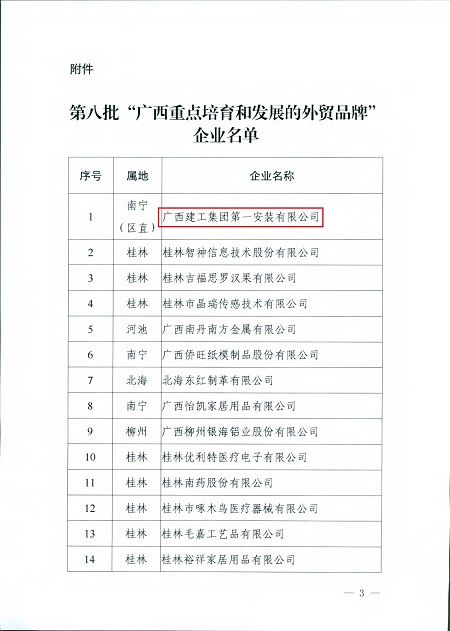 近日,广西建工集团第一安装有限公司成功入选 “广西重点培育和发展的外贸品牌”(简称“广西重点外贸品牌”)企业名录,这是继今年9月 “广西建工一安”品牌名称获评“中国出口商品品牌”后,公司获得的又一项品牌荣誉。