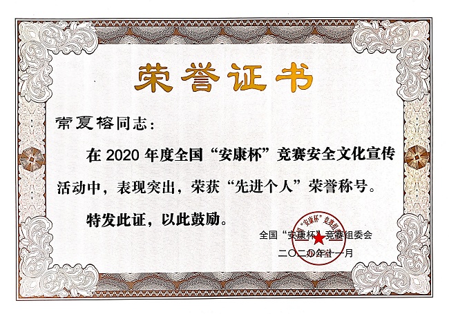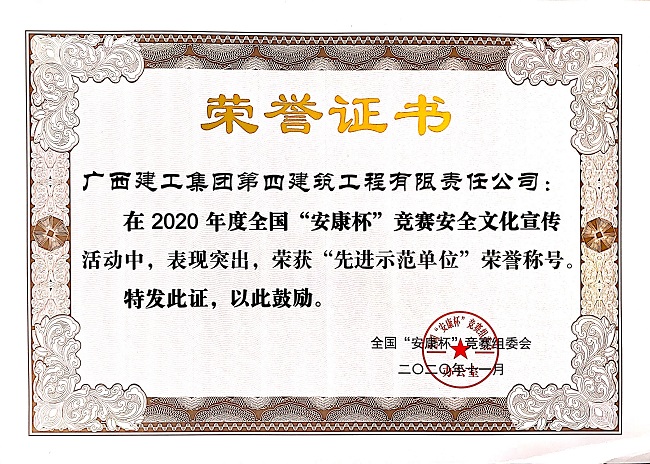 近日,由中华全国总工会、中华人民共和国应急管理部联合组织开展的2020年度全国“安康杯”竞赛安全文化宣传工作评比表彰工作落下帷幕,广西建工集团第四建筑工程有限责任公司获得“先进示范单位”称号,是桂林市和集团公司唯一获此殊荣的单位。公司职工常夏榕荣获“先进个人”称号。