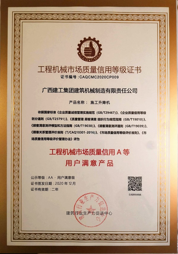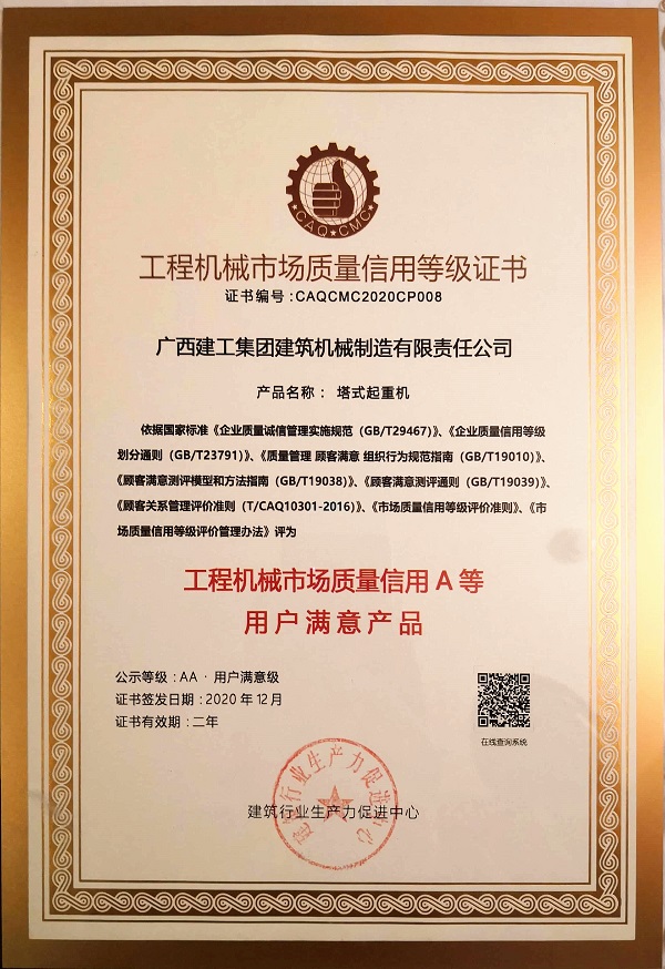 12月8日,广西建工集团建筑机械制造有限责任公司两大核心拳头产品塔式起重机和施工升降机在中国工程机械工业协会用户工作委员会年会上,再次获评“工程机械市场质量信用A等用户满意产品AA级”称号。